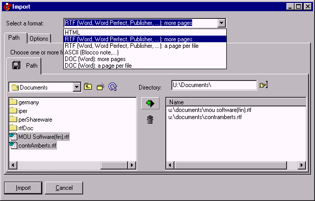 With this function you can import Txt and Rtf files for example from MSWord or Word Perfect. You can import more than one file a time, just move files from the file manager (bottom left) to the right list. Click on the image to get Help: