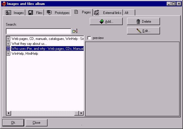 List of available pages in current hypertext Preview of the selected page (you must check the box if you want it) Function non available in EasyWebEditor Images and files album Images and files album Images and file album Function non available in EasyWebEditor