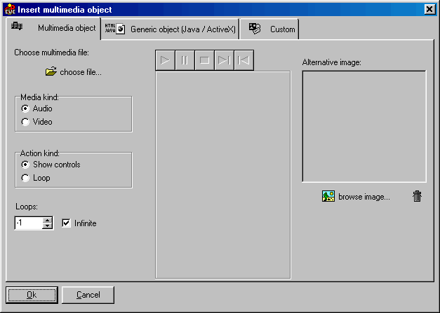 With this function you can insert sounds or animation in your site. Click on the image to get Help:
