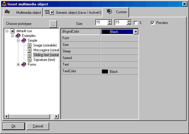 Insert sound or animation Insert generic object (Java, Active X ...)