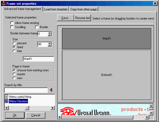With this window you can assign the frame set layout for the current page. You can define a layout “from scratch”, by selecting number, position, width, properties of each frame (scrolling, border, fixed or percent width). You can copy layouts from other pages, or from templates. Click on the image to get Help: