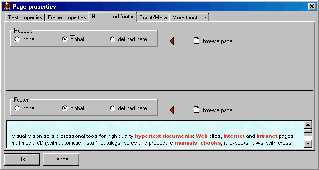 Each page can have its own header and/or footer. You can also define a global header and/or footer for all the hypertext (Hypertext >Properties): in that case it is always possible to setup a different header or footer for a given page, or to disable at all any header and/or footer for a given page (it is sufficient to choose “none”). Click on the image to get Help: