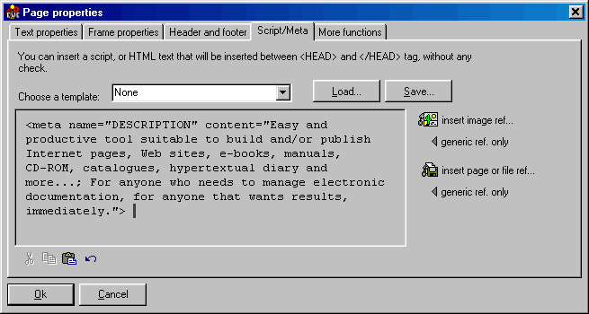 With this tab you can insert code within <HEAD> and </HEAD> tags. Click on the image to get Help: