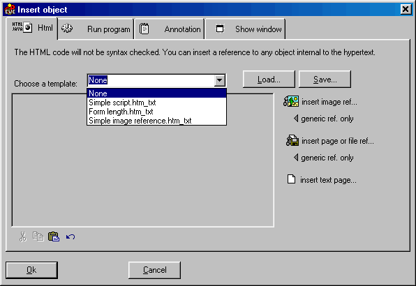 In other words, you simply tell EasyWebEditor where to place the name of an image or of a link in the code, and that name will be inserted on-the-fly, when the HTML pages are actually generated. This way, the reference is always up to date, avoiding the need of manual maintenance of the code. Click on the image to get Help: