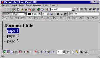 ...then we will place a link to the page “Page 1”. This page doesn’t exists, but we don’t need to create it directly (though it is possible, with “File >Add new page...”), as a page creation can be done simultaneously with a link definition.