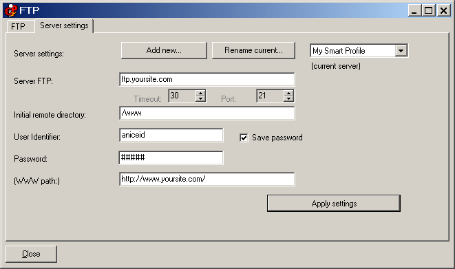 server FTP: (also known as host, ftp server, servername; you may also insert the IP here, e.g. 12.22.33.44) ftp.yoursite.com